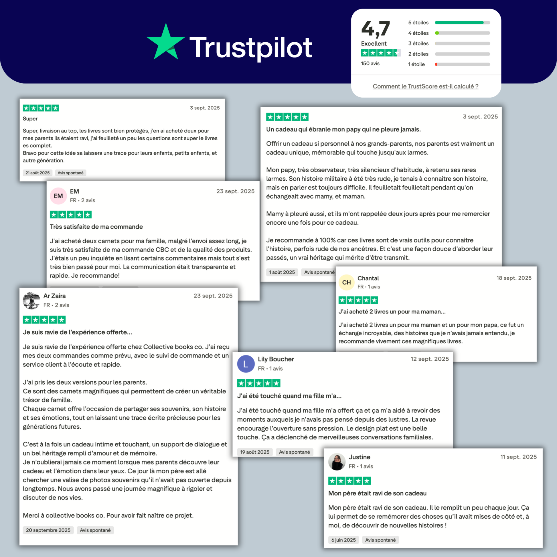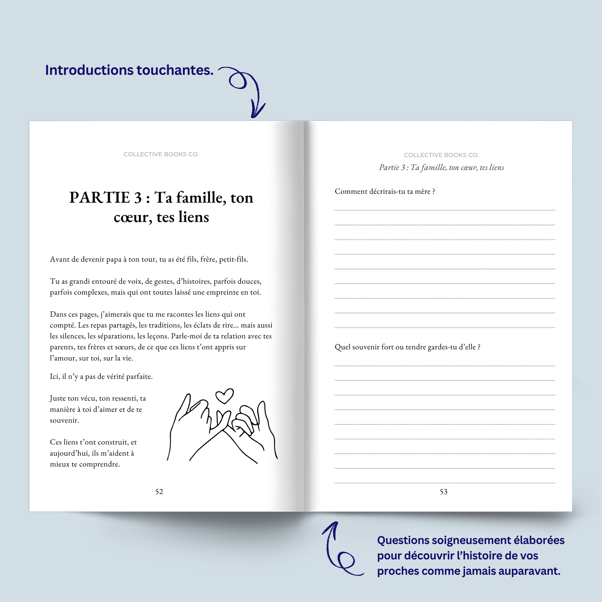 Ce journal guidé unique invite vos proches à partager leurs souvenirs, leurs émotions et les leçons qu'ils souhaitent transmettre.