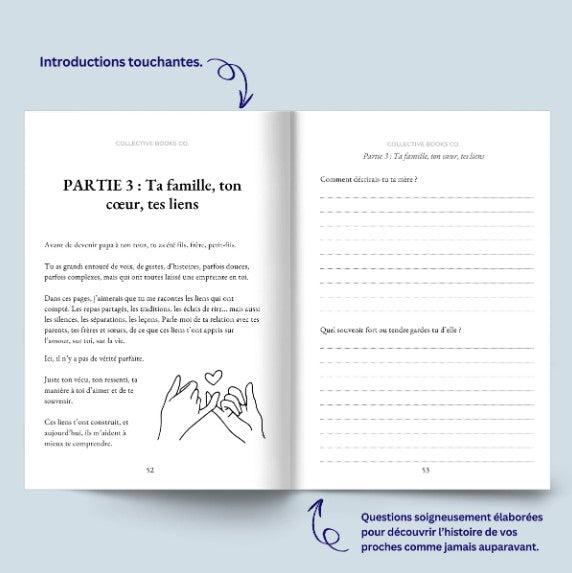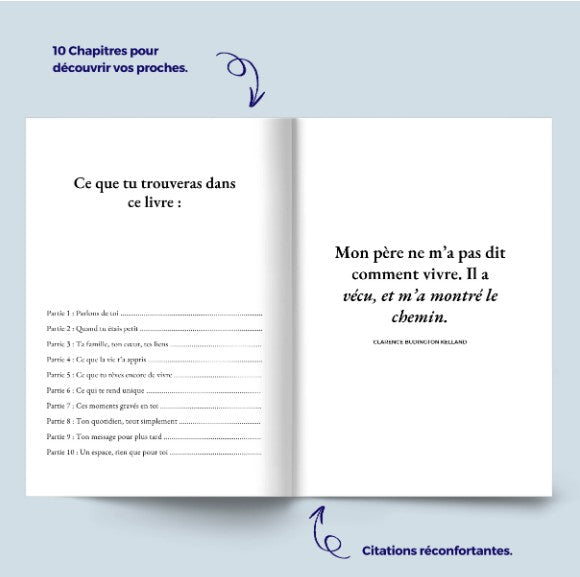 Ce journal guidé unique invite vos proches à partager leurs souvenirs, leurs émotions et les leçons qu'ils souhaitent transmettre.