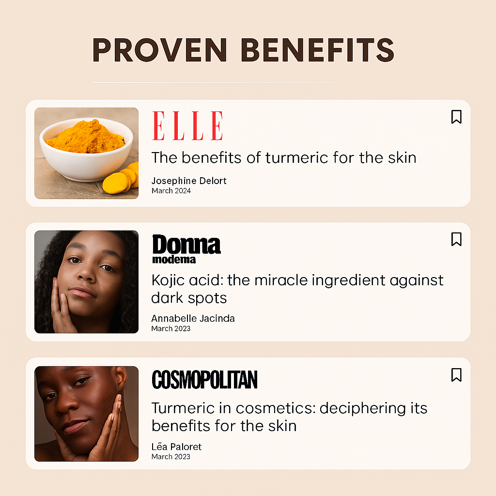 With 100% natural ingredients, including turmeric and kojic acid, this formula fades dark spots, evens skin tone, and restores your glow from the first use.Skin feels softer, brighter, and more soothed with every application — your new ritual to boost confidence and reveal your natural beauty.